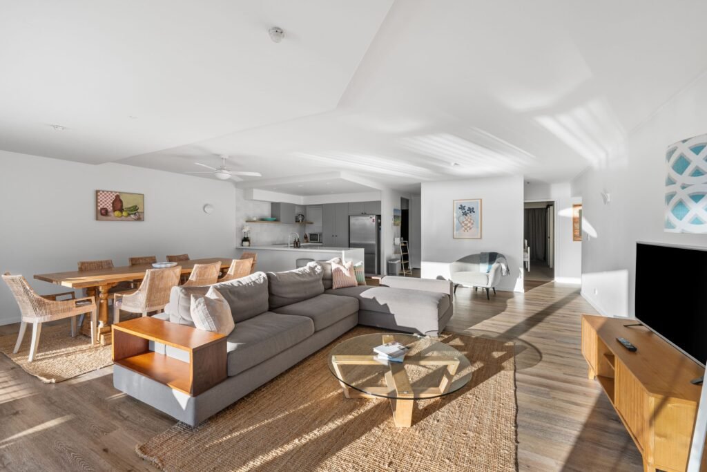 The contemporary central kitchen features quality Bosch appliances, stone bench tops, and timeless VJ panelled cabinetry. Drift off to the peaceful sounds of the sea in one of the two spacious air-conditioned bedrooms, each with modern ensuites, built-in robes, and direct balcony access with a leafy palm-lined outlook. The larger master bedroom includes a built-in desk and full-sized ensuite with bath and shower. The apartment also features a handy study nook that opens to a compact third sleeping space with a built-in bunk bed, perfect for children or visitors. Uniquely, this well-equipped and completely furnished space can comfortably accommodate up to six adults. The master bedroom with a queen bed, the second bedroom with two single beds, and the third room with a bunk bed, each designed to provide a restful night’s sleep. With an internal laundry, powder room, built-in seating, and great storage, the apartment offers the ultimate in top-class coastal living. Resort-style facilities include a pool, spa, tennis court, gym, sauna, BBQ area, and games room. Linen and basic amenities are included, along with a starter pack of essential items. In line with Gold Coast City Council policies, the property maintains a strict No Party and No Commercial Functions policy and is situated in a quiet residential suburb. Noise is to be kept to a minimum, observing “Quiet Time” from 10pm to 8 am.